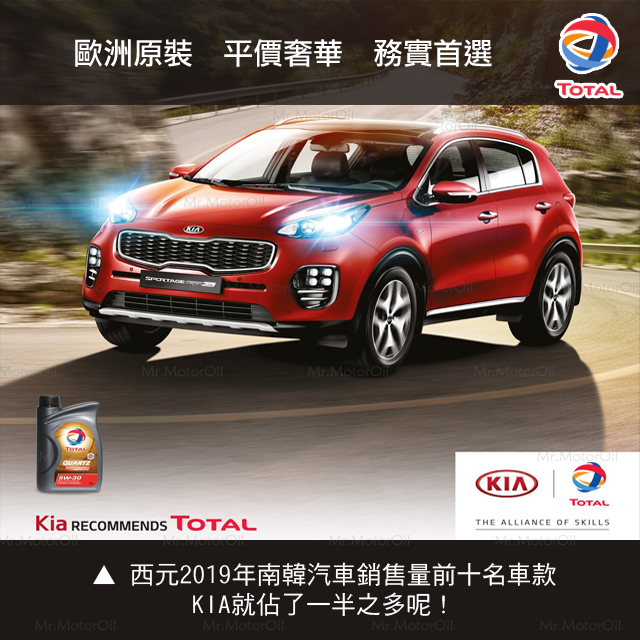 韓國起亞(KIA):法韓雙方的技術聯盟合作計畫即將邁入第十個年頭,TOTAL機油也成為KIA遍布全球180個國家、近5,500個授權經銷據點中,取得原廠推薦和技師背書的售後潤滑油唯一供應商。市場熱銷的TOTAL QUARTZ INEO MC3 5W30,其低硫、低灰份配方與各項卓越屬性更是KIA建議的換油首選之一。
