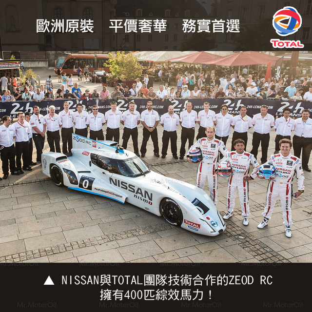 日本日產(NISSAN):以優化黏度、低溫啟動時維持高度抗磨損效能,保護引擎全時間順暢輸出不衰退的日規原廠純正NISSAN GENUINE OIL機油系列,即為委託TOTAL實驗室所研製的OEM代表油品。同時,TOTAL還積極參與NISSAN具挑戰性與前瞻性的ZEOD RC零排放油電賽車計畫,更一舉締造出時速300公里以上的綠能車種里程碑!