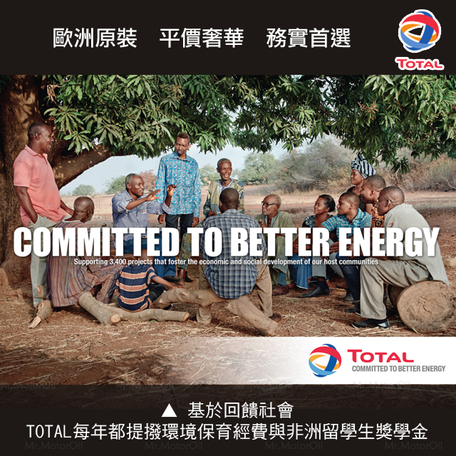 『Committed to better energy!』(致力於更好的能源!),誠如『TOTAL』集團的品牌座右銘,致力提供全球每一位消費者更好的能源服務,自西元1924年以來,從法國出發,近一世紀屹立不搖的可靠形象,遍布世界百餘國市場的扎根佈局,Top Oil, Top Automobiles` Lubricant,頂級的油品孕育提煉出頂級的潤滑油,『TOTAL』機油,100%值得您和愛車的信賴。