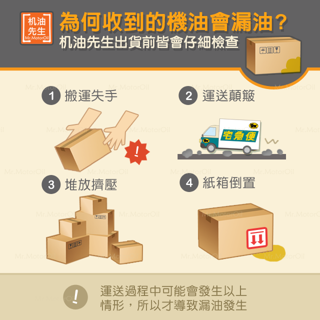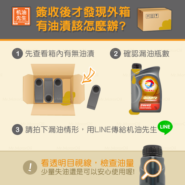 收件時發現外箱漏油 請不要簽收,並聯絡机油先生客服,我們會當天為您重新出貨