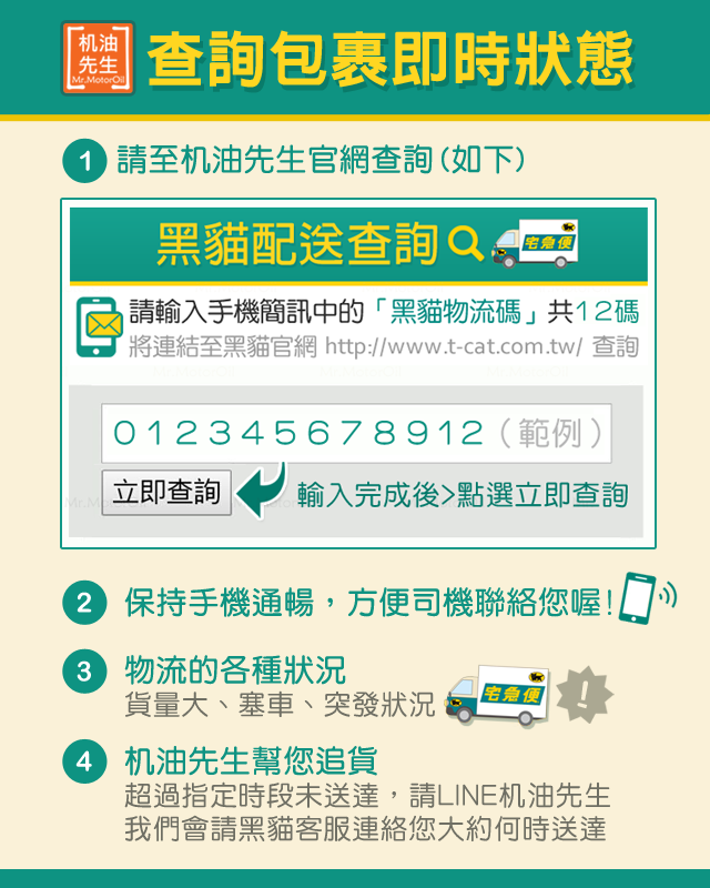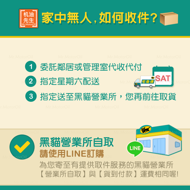 ● 机油先生辦公室、倉庫均不對外營業,歡迎使用LINE訂購,黑貓宅急便配送到家最便利!