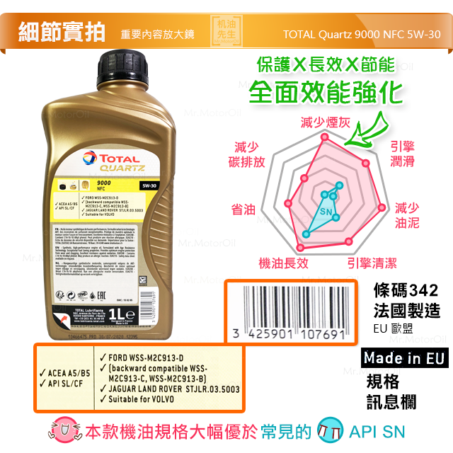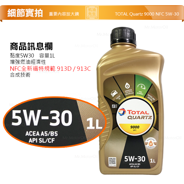 TOTAL NFC 5W30擁有基礎的FORD 913-C/913-D認證(省油型認證),是TOTAL專為福特FORD開發的基礎機油,有良好的省油能力,高溫保護力有中級等級(HTHS大於2.9)能滿足溫和駕駛所需,價格也是FORD機油中最超值的!