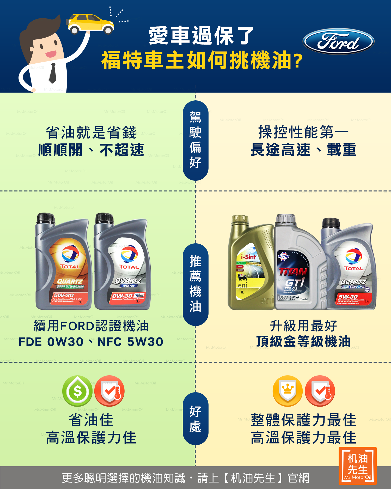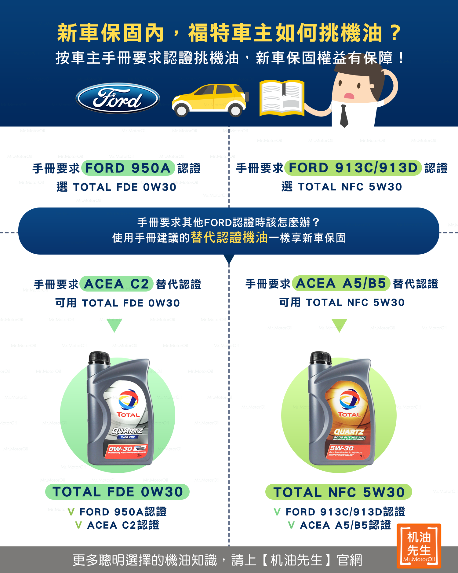 有FORD認證的機油很難找?机油先生特地為福特汽油車、柴油車車主引進FORD 950-A認證、913-C/913-D認證兩款TOTAL高品質機油,讓您也能在保固期內帶去原廠、省錢保養!