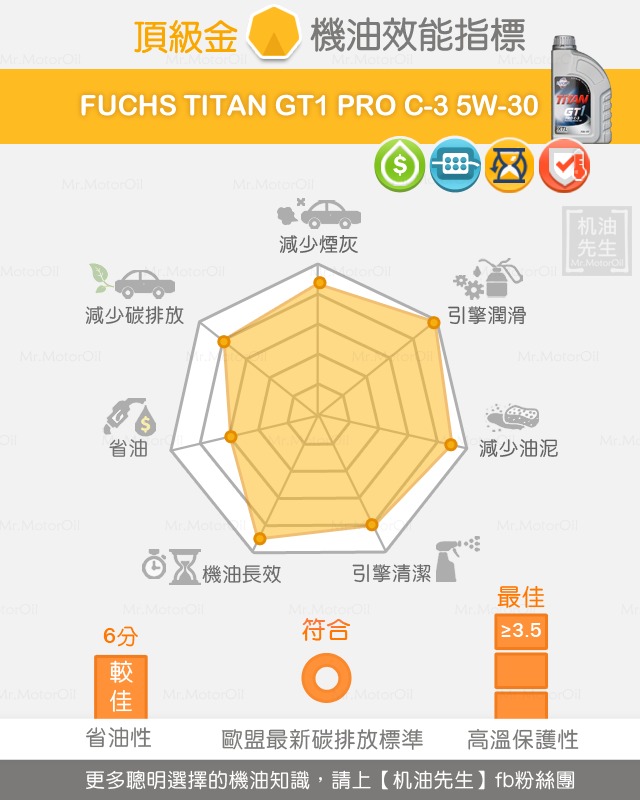 机油先生為了讓大家能夠更快、更方便地自備機油,將機油按認證等級高低為依序分為「頂級金」、「性能紅」、「平價藍」、「節能綠」、「基礎灰」。其中能同時取得四大車廠最頂級認證(MB229.51、BMW LL-04、VW504/507、Porsche C30)的機油才能列入「頂級金等級」,是機油中的精品!「頂級金等級」機油不只整體保護力比TOTAL FDE 0W30好、高溫保護力也比TOTAL FDE 0W30好,推薦希望強化高溫保護力、使用對車更好、品質和等級最好的機油的車主使用。