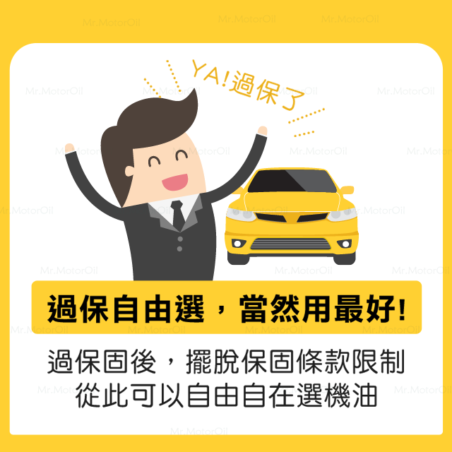 先恭喜您終於可以擺脫新車保固條款的限制、自由自在的選擇機油了!您可以繼續使用原來的機油,也可以選擇對車更好、品質和等級最好、更符合自己偏好的機油。