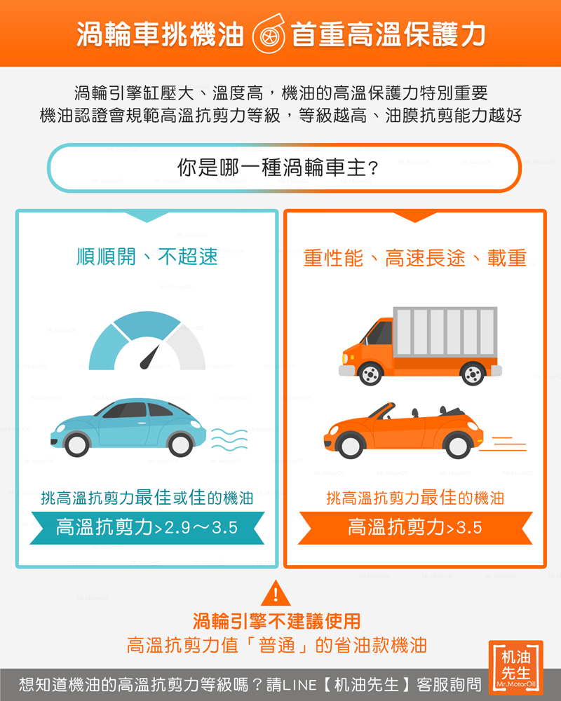 渦輪引擎選擇機油關鍵在高溫抗剪力!機油認證會規範機油的高溫抗剪力等級。由於FORD認證皆為省油型認證,高溫抗剪力等級只有中等(HTHS>2.9)或基礎(HTHS>2.6),高溫抗剪力等級中等,只適合順順開、不超速的渦輪車。如果您是經常長途高速或有載重物的需求的車主,為了優先確保渦輪引擎的高溫保護力充足,愛車過保後,可以更換高溫抗剪力等級為最高(HTHS>3.5)的「頂級金等級」或「性能紅等級」機油。