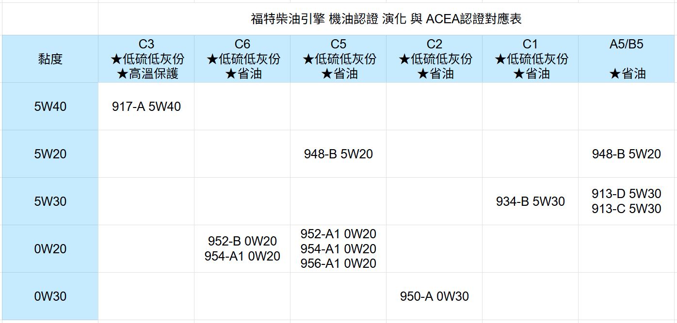 福特所有柴油認證都可以用 ACEA認證 加上 特定的黏度 來替代。
