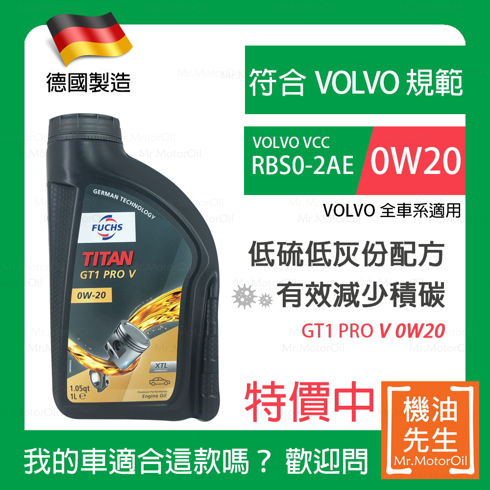 現貨【機油先生】【單瓶1L】德國製FUCHS TITAN GT1 PRO V 0W20,VOLVO RBS0-2AE+C5 保護cDPF