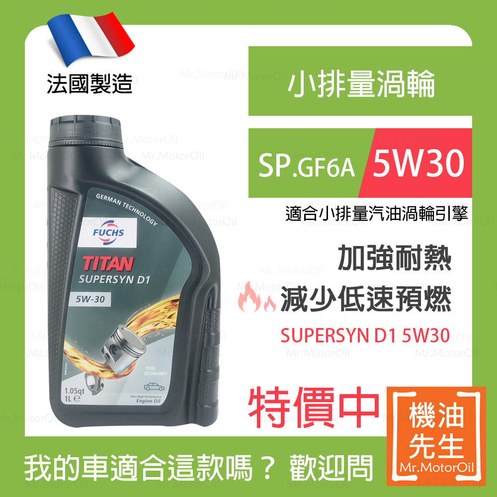 限時優惠▼預購【機油先生】【單瓶1L】FUCHS TITAN SUPERSYN D1 5W30【法國製】,SP認證 預防低速預燃