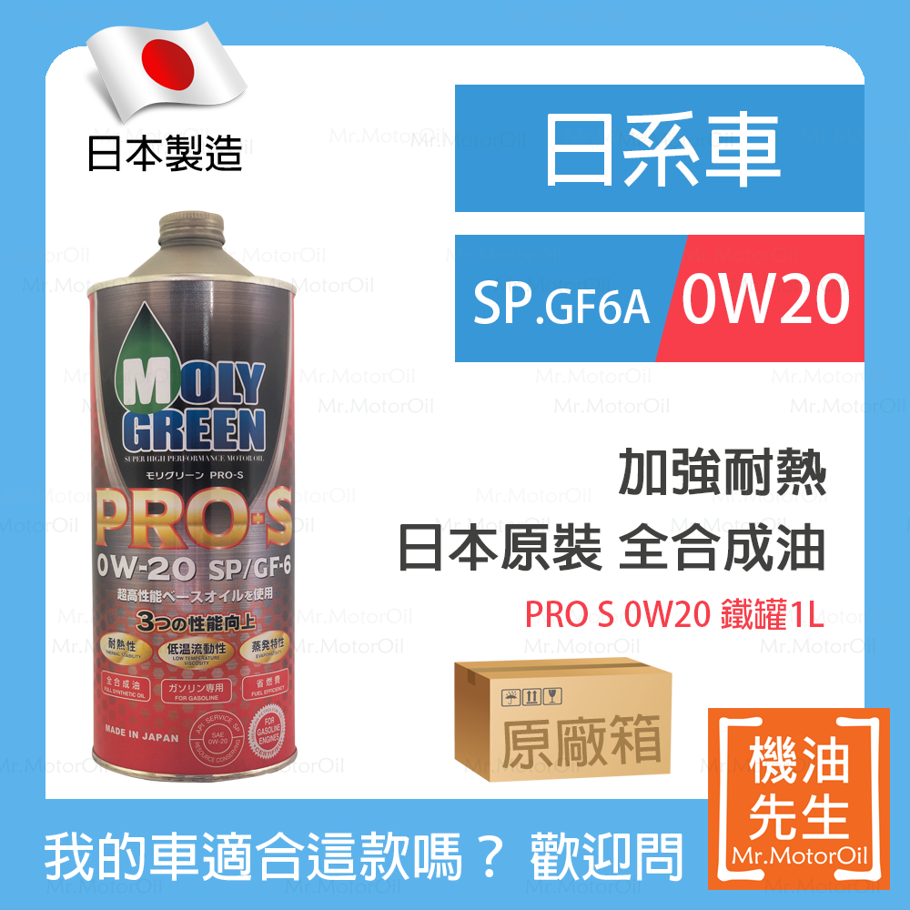 預購【機油先生】【原廠箱20L】日本製MOLYGREEN PRO S 0W20,SP、GF6A,全合成