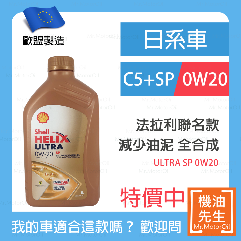 預購【機油先生】【單瓶1L】歐盟製SHELL HELIX ULTRA SP 0W20MG全車系,油電、小排量渦輪 C5+SP 雙效合一