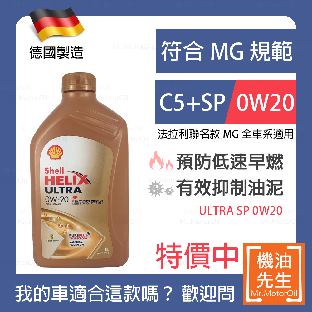 預購【機油先生】【單瓶1L】歐盟製SHELL HELIX ULTRA SP 0W20MG全車系,MG首選C5+SP 全合成