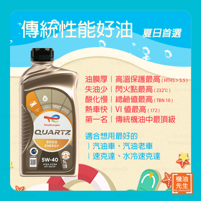【TOTAL 9000 ENERGY 5W40】屬性 ● 高硫磷灰份配方的傳統好油 ● 閃火點高(232)、高溫抗剪力最高(大於3.5)、總鹼值高(TBN 10)、VI值高(172) ● 傳統好油中最好、高認證最多的機油(MB 229.5、VW 502/505、Porsche A40、SN) ● 夏日用機油