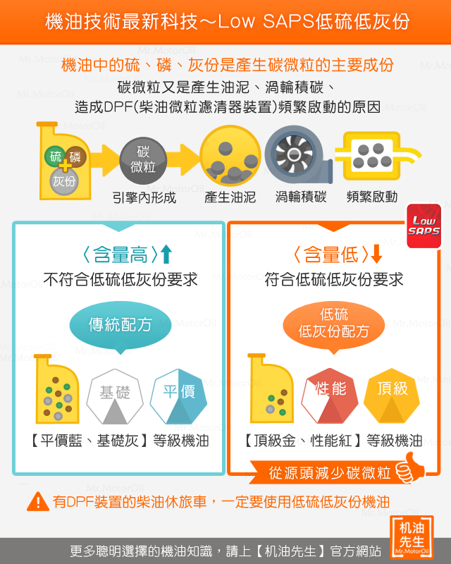 (補充:低硫低灰份機油建議的更換里程是傳統機油的2~3倍,代表低硫低灰份機油要10000至15000公里才會變得和傳統機油一樣髒)