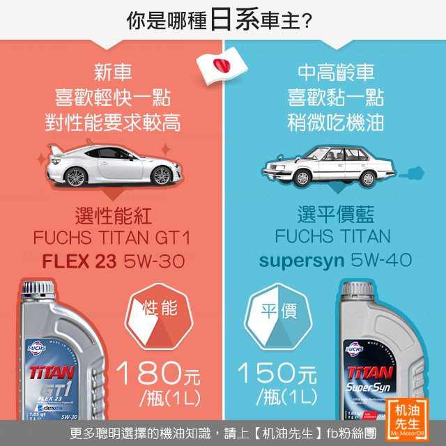 推薦您德國原裝進口180元/L【FUCHS TITAN GT1 FLEX 23 5W-30】【性能紅】等級的機油,比起只有SN認證的原廠全合成機油,更能滿足您對機油效能表現的期待!