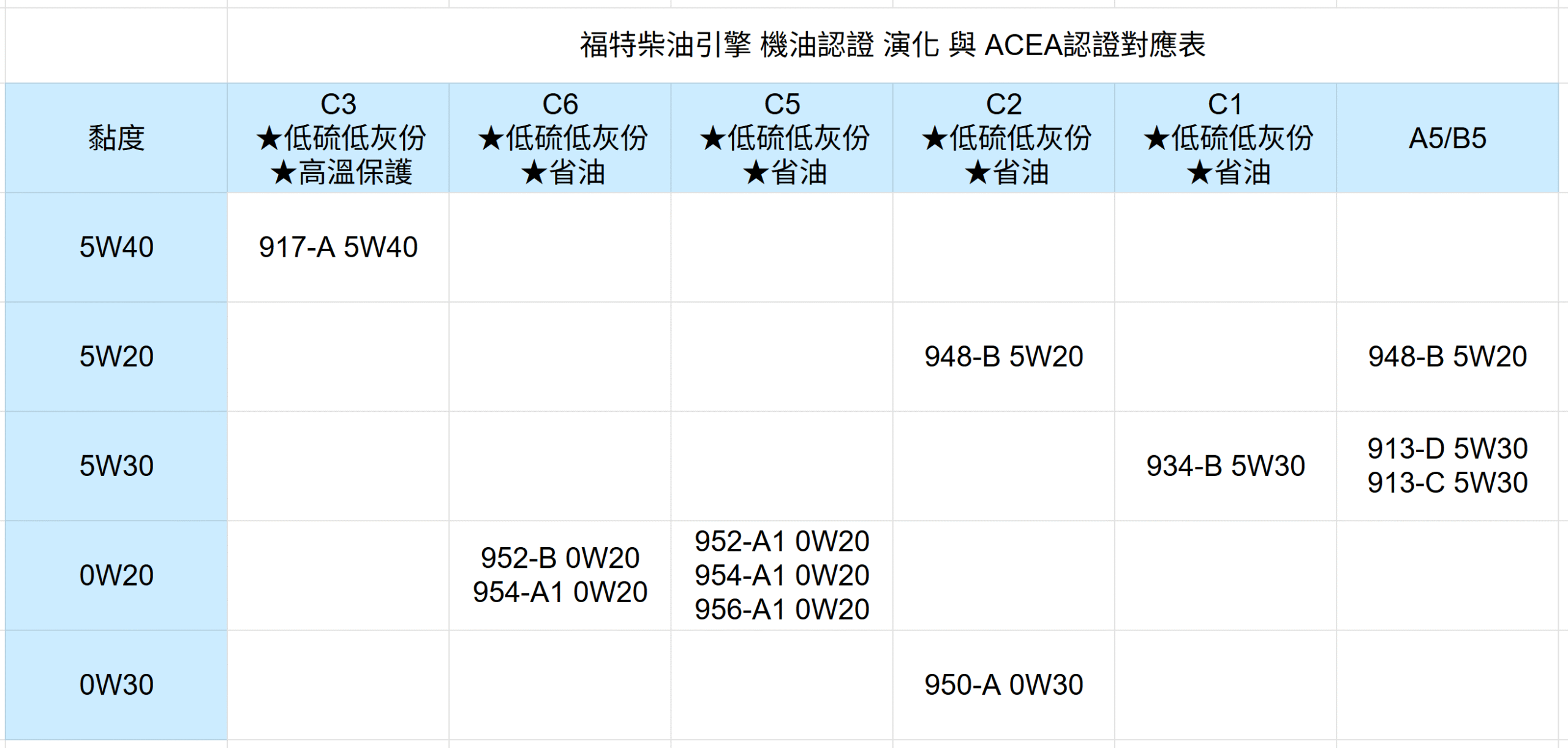 福特所有柴油認證都可以用 ACEA認證 加上 特定的黏度 來替代。