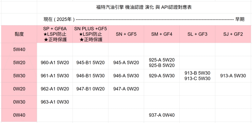 而福特汽油引擎認證都是隨著 API 認證的演進,再加上綁定黏度創造出來的。