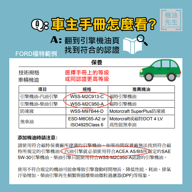 讓我們看一下車主手冊常常是怎麼寫的?例如:「建議您的愛車使用福特原廠 Motorcraft 機油。若無法取得福特原廠 Motorcraft 機油,您也