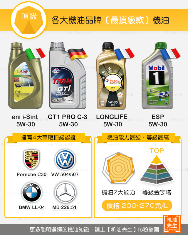 机油先生按等級分類,讓您一眼就能分辨機油等級,在「頂級金等級」內只收錄符合以下條件的各品牌最頂級機油: